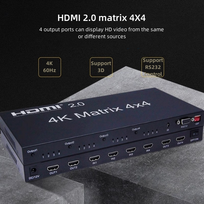 The HDMI matrix 4×4 reforms and amplifies the input signal, and transmits it through HDMI cable without loss. It provides solutions for HDTV, set-top box, DVD and projector factories, data center control, conference room presentations, schools and corporate training environments.