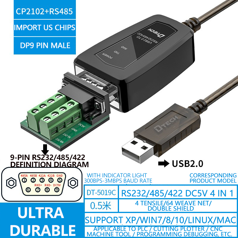 This universal USB2.0 to RS232/422/485 converter does not require an external power supply, is compatible with USB2.0, RS232/422/485 standards, and can convert single-ended USB signals into RS232/422/485 signals, providing The surge protection power of 600W, as well as the surge voltage generated on the line due to various reasons and the extremely small inter-electrode capacitance ensure the high-speed transmission of the RS232/422/485 interface, and the RS232/422/485 port is connected through a DB9 male connector . The converter has zero-delay automatic transmission and reception conversion inside the converter, and the unique I/0 circuit automatically controls the direction of data flow.