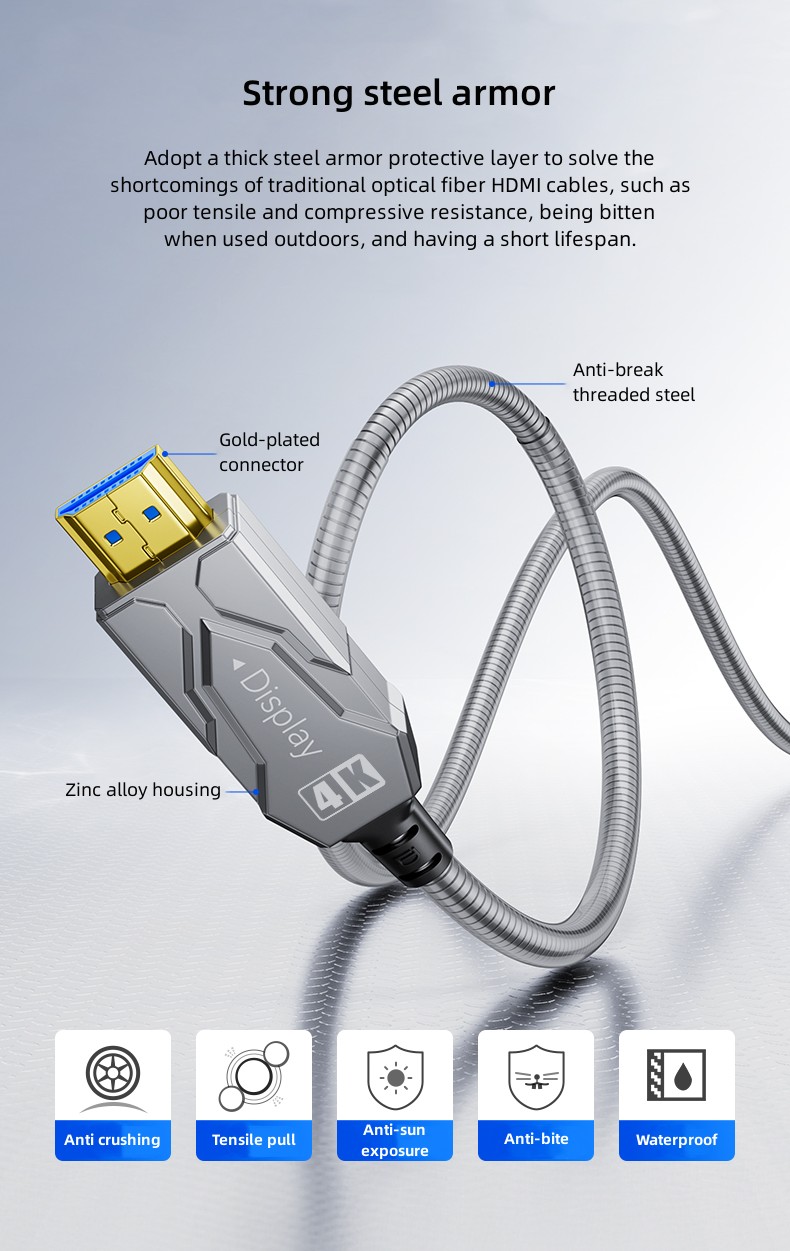 Adopt a thick steel armor protective layer to solve the shortcomings of traditional optical fiber HDMI cables, such as poor tensile and compressive resistance, being bitten when used outdoors, and having a short lifespan.