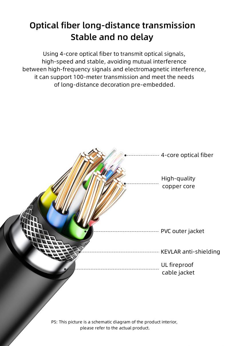 Using 4-core optical fiber to transmit optical signals, high-speed and stable, avoiding mutual interference between high-frequency signals and electromagnetic interference, it can support 100-meter transmission and meet the needs of long-distance decoration pre-embedded.