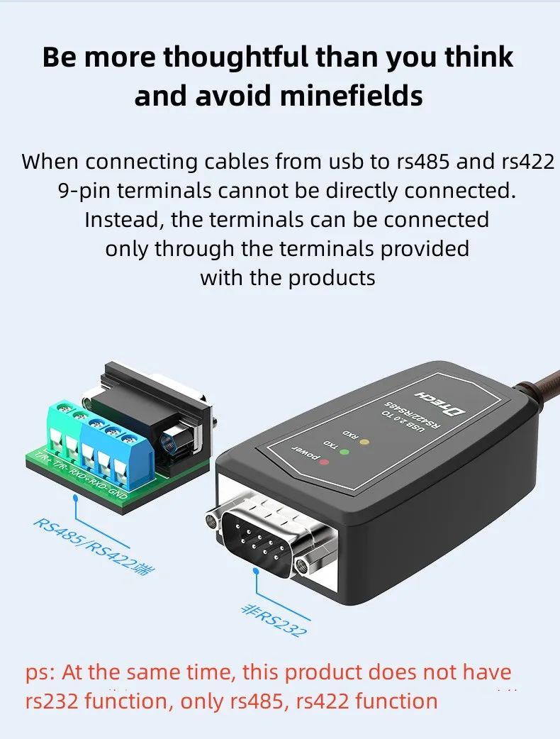 When connecting cables from usb to rs485 and rs422 9-pin terminals cannot be directly connected. Instead, the terminals can be connected only through the terminals provided with the products.