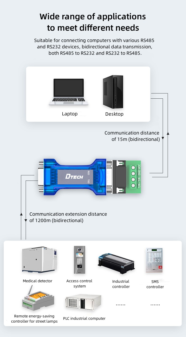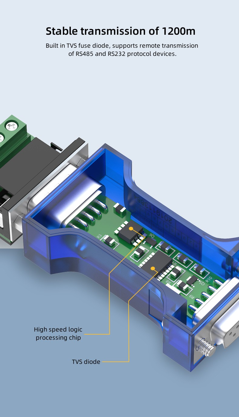Suitable for connecting computers with various RS485 and RS232 devices, bidirectional data transmission, both RS485 to RS232 and RS232 to RS485.