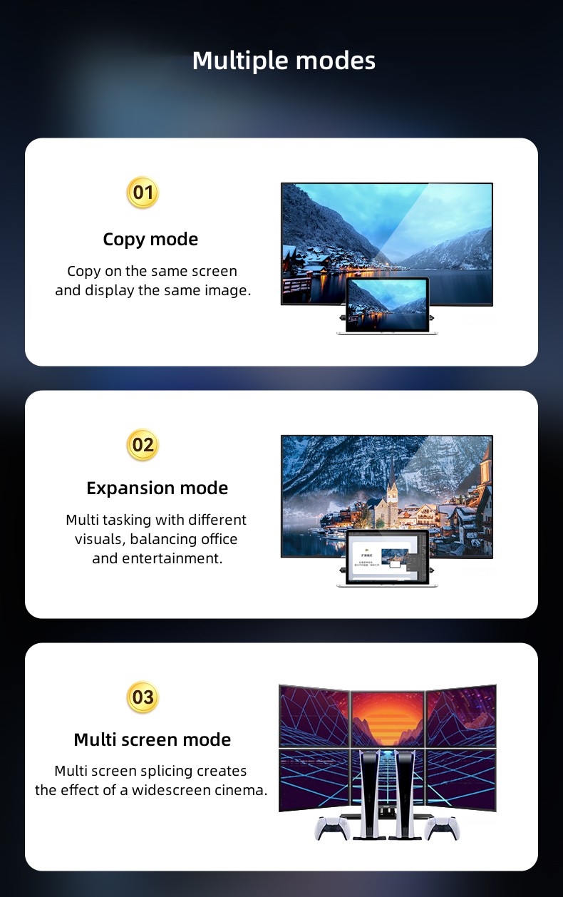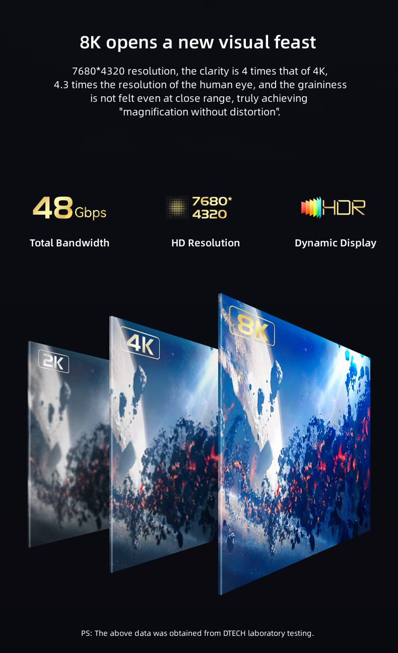 2. Supports 8K@60Hz resolution and is backward compatible with other resolutions and supports dynamic HDR.