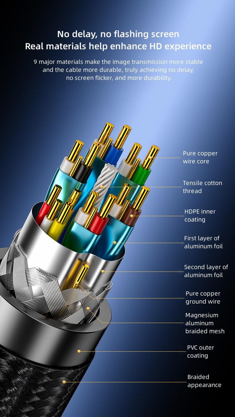 1. The 8K cable can achieve 24bit/192KHz audio accuracy, and the color gradient effect is smoother and more natural.