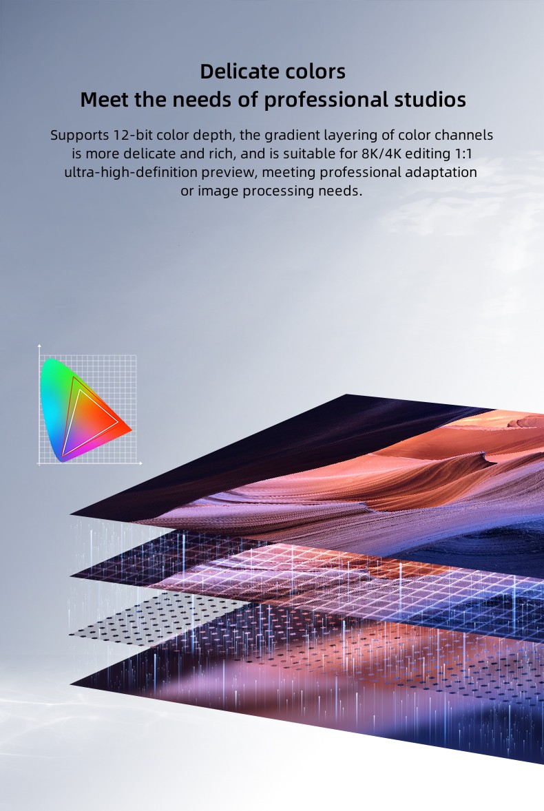 Supports 12-bit color depth, the gradient layering of color channels is more delicate and rich, and is suitable for 8K/4K editing 1:1 ultra-high-definition preview,