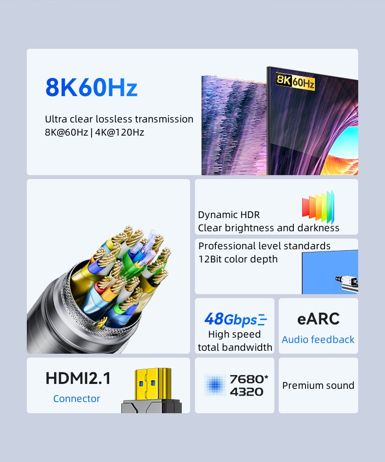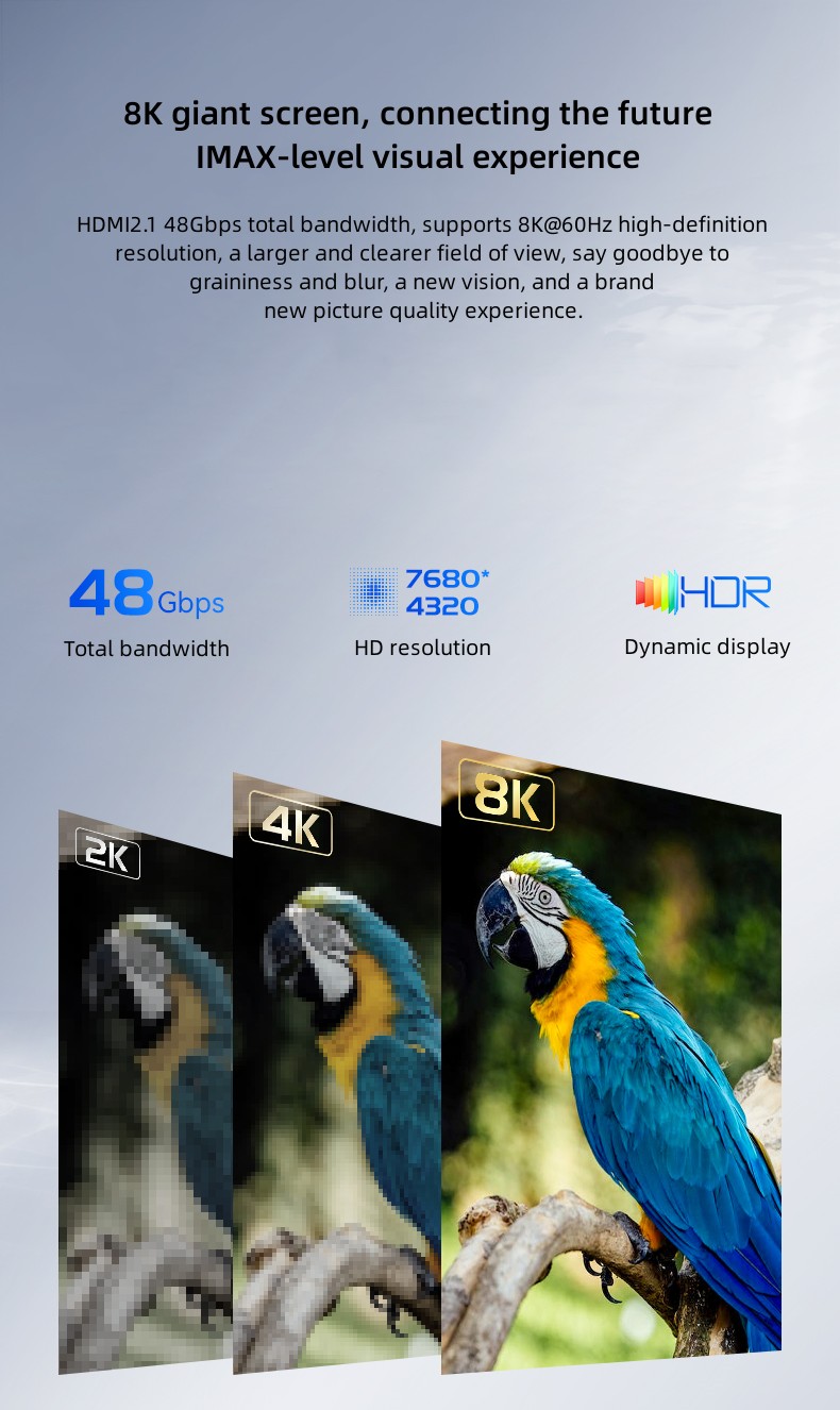 HDMI2.1 48Gbps total bandwidth, supports 8K@60Hz high-definition resolution, a larger and clearer field of view, say goodbye to graininess and blur,