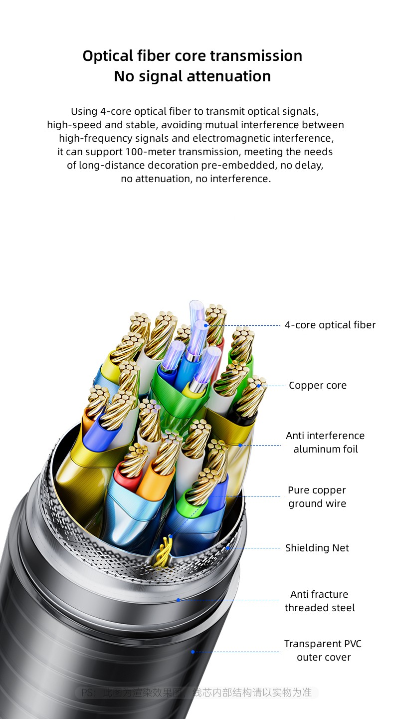 Adopt a thick steel armor protective layer to solve the shortcomings of traditional optical fiber HDMI cables, such as poor tensile and compressive resistance,