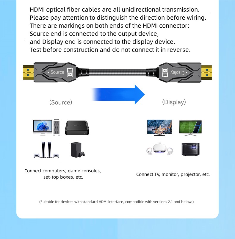 HDMI optical fiber cables are all unidirectional transmission. Please pay attention to distinguish the direction before wiring. There are markings on both ends of the HDMI connector: