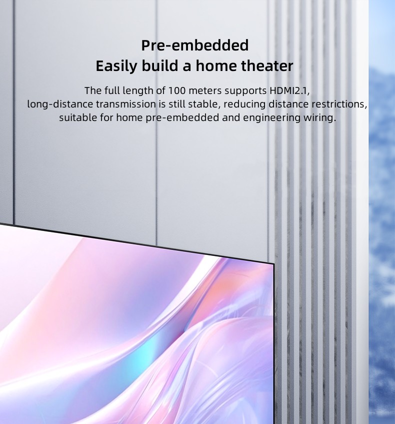 The full length of 100 meters supports HDMI2.1, long-distance transmission is still stable, reducing distance restrictions, suitable for home pre-embedded and engineering wiring.