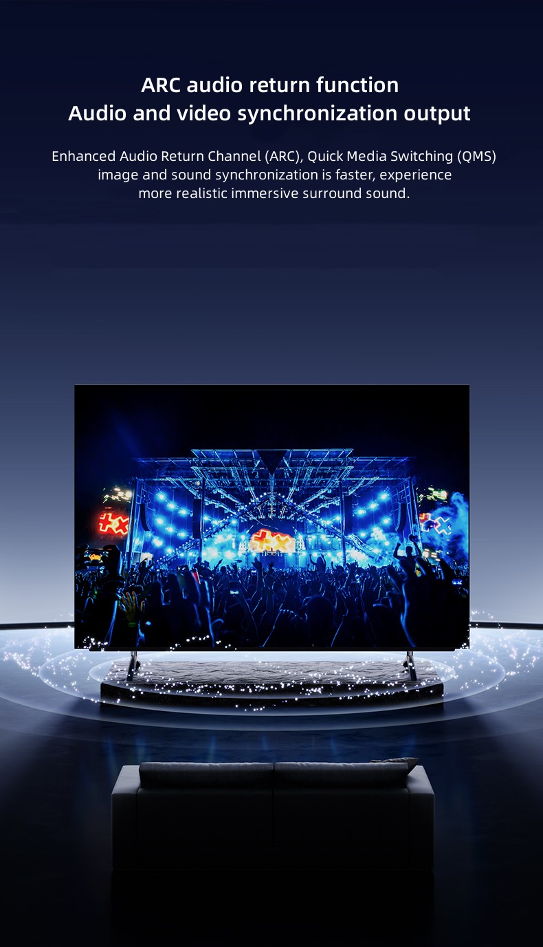 Enhanced Audio Return Channel (ARC), Quick Media Switching (QMS) image and sound synchronization is faster, experience more realistic immersive surround sound.