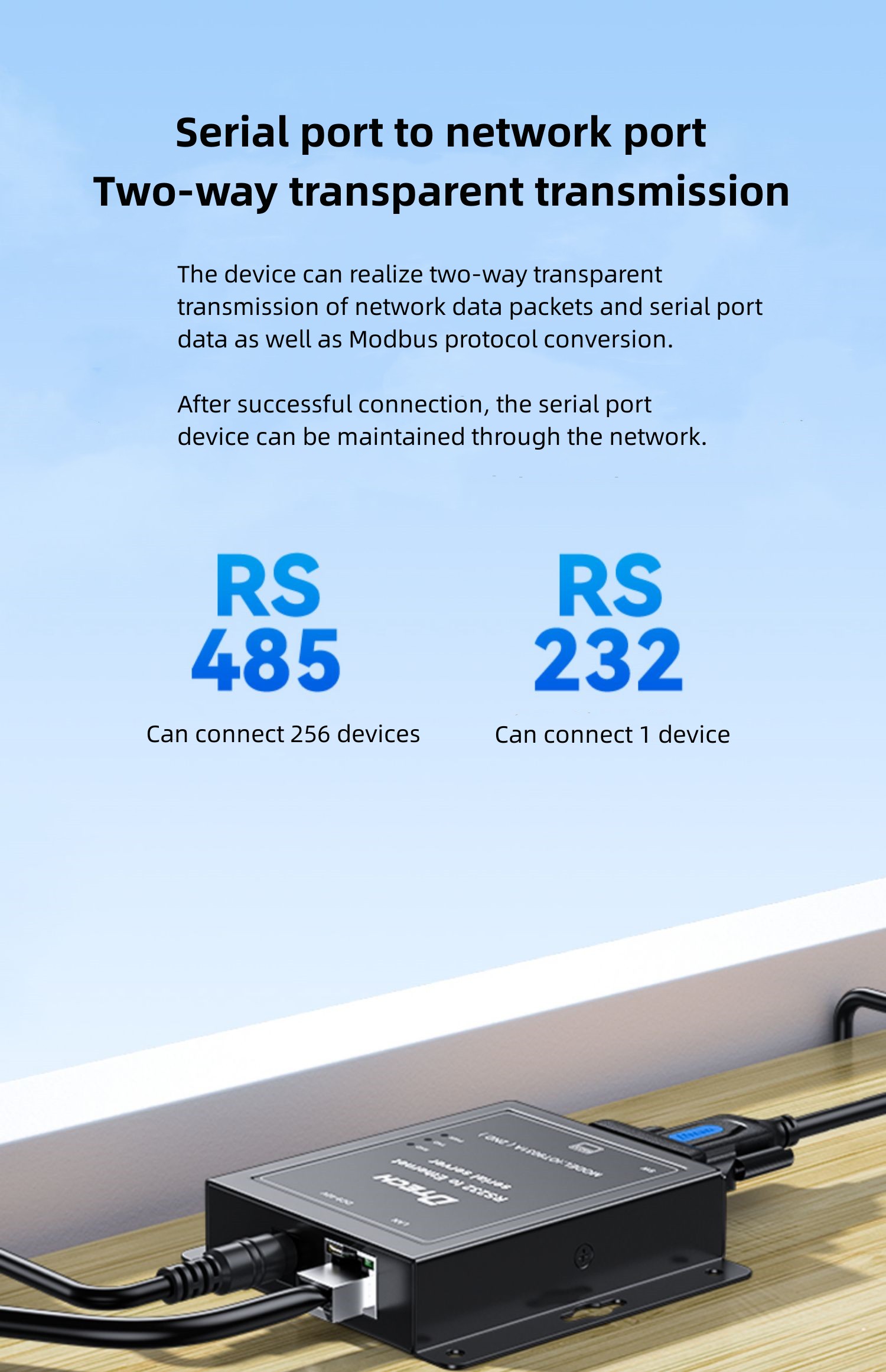The device can realize two-way transparent transmission of network data packets and serial port data as well as Modbus protocol conversion. After successful connection, the serial port device can be maintained through the network.