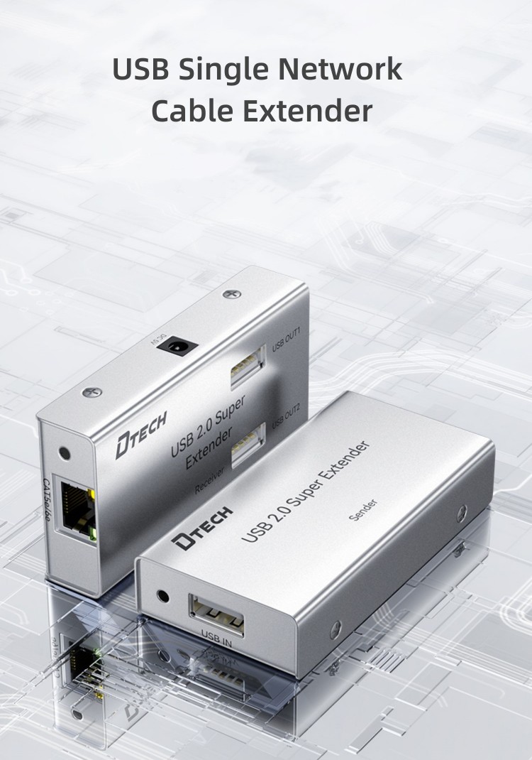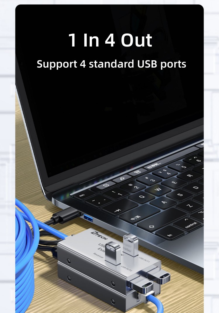 (1) USB signal is transmitted using a single network cable. The use of Category 5e network cable can extend 100 meters, and Category 6 network cable can extend 150 meters.