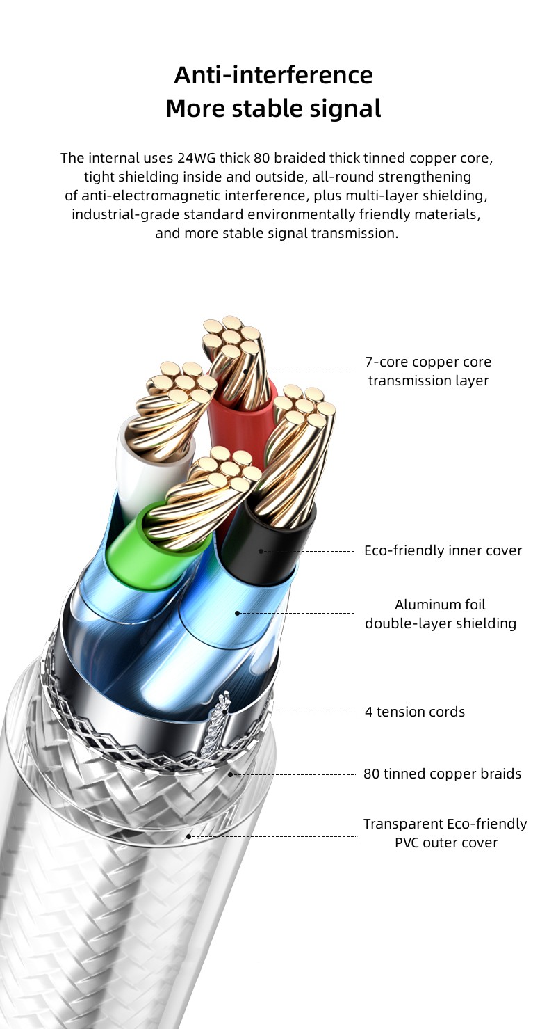 The internal uses 24WG thick 80 braided thick tinned copper core, tight shielding inside and outside, all-round strengthening of anti-electromagnetic interference,