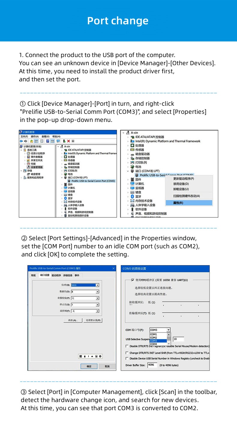 ① Click [Device Manager]-[Port] in turn, and right-click “Prelifie USB-to-Serial Comm Port (COM3)”, and select [Properties] in the pop-up drop-down menu.