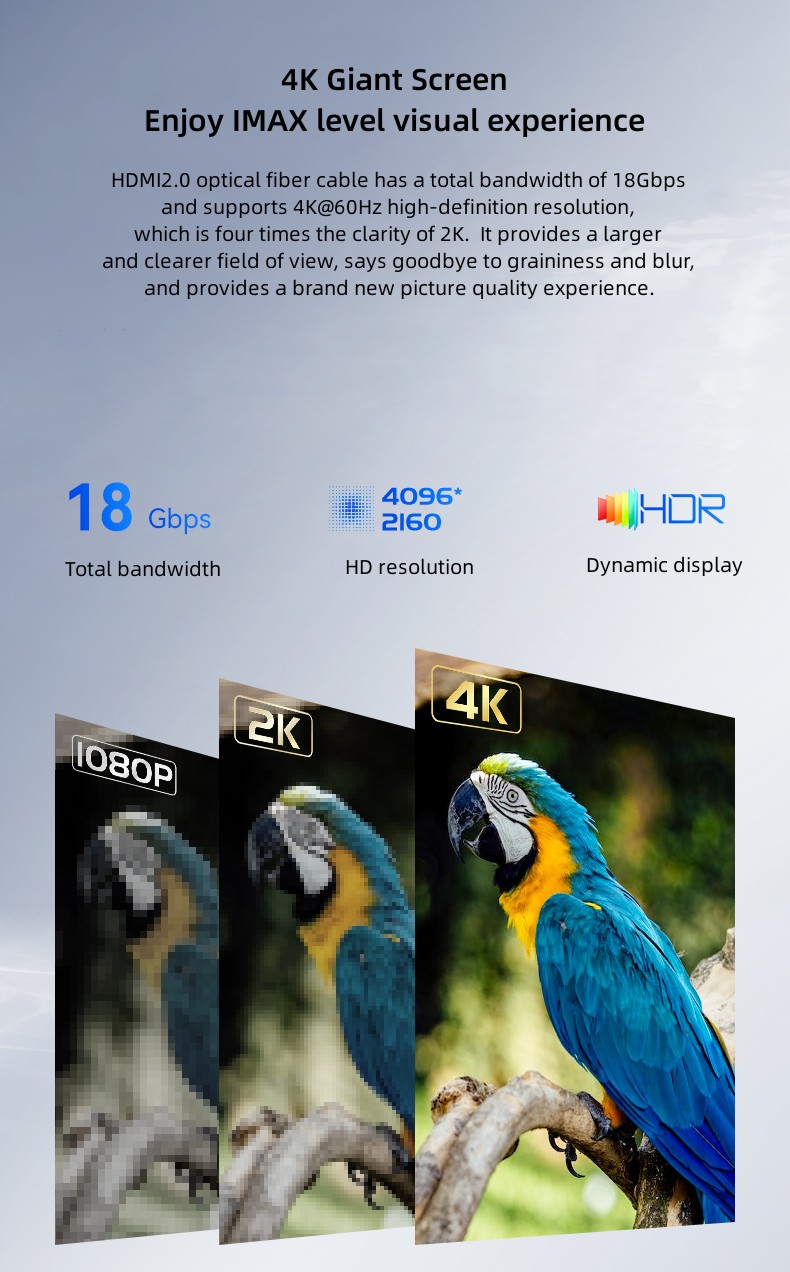 This 4K Fiber Armoured HDMI Cable uses advanced fiber optic transmission technology to support resolution up to 4096×2160 pixels. HDMI2.0 optical fiber cable has a total bandwidth of 18Gbps and supports 4K@60Hz 2K@120Hz refresh rate, which is four times the clarity of 2K. It provides a larger and clearer field of view, says goodbye to graininess and blur, and provides a brand new picture quality experience. Viewers can enjoy a more realistic and shocking visual feast, and feel as if they are in the scene.