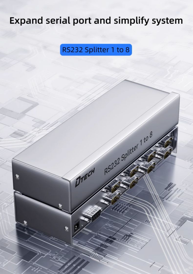 The main function of the RS232 1-input 8-output distributor is to convert a single RS232 serial port input signal into 8 RS232 serial port output signals. RS232 db9 splitter provides an efficient and flexible serial port expansion solution through a simple connection method. Whether in the fields of industrial automation, communication equipment, data acquisition or remote monitoring, users can benefit from its powerful functions and convenient operation.