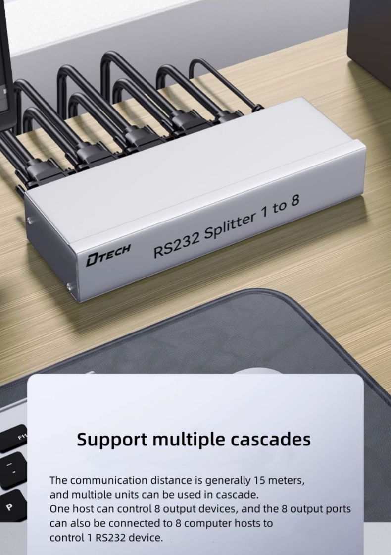 RS232 Serial Splitter conforms to ergonomic design, metal matte texture, mature technology, metal shell, wear-resistant and high temperature resistant, shock-resistant and drop-resistant, and fast heat dissipation. The communication distance is generally 15 meters. Multiple units can be cascaded and used. One host can control 8 output devices. 8 output ports can also connect 8 computer hosts to control 1 RS232 device.