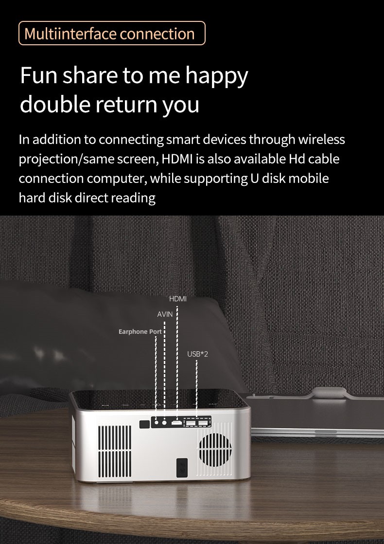 In addition to connecting smart devices through wireless projection/ same screen, HDMI is also available Hd cable connection computer, while supporting U disk mobile hard disk direct reading.