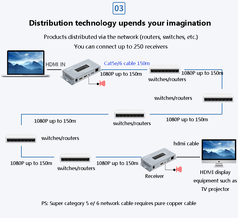 (6) Nganggo kabel standar HDMI, jarak pangiriman tungtung input tiasa ngahontal 10 méter, sareng jarak pangiriman tungtung kaluaran tiasa ngahontal 5 méter.